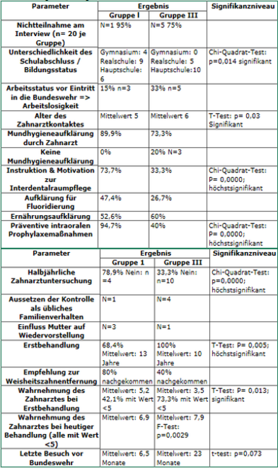 Aus dieser Berechnung haben die Faktoren für die Compliance (die Halbjahres-Kontrolle) mit p= 0,0196 und die erhaltenen Individualprophylaxe (die erhaltenen präventiven Maßnahmen in der Zahnarztpraxis) mit p= 0,0180 zu einer signifikanten Assoziation geführt.
