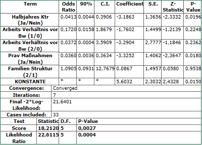 Die Entwicklung zu einer Therapiebedürftigkeitsgruppe ist von verschiedenen Faktoren abhängig. Um diese Faktoren herauszufiltern, wurden die Extremgruppen (Gruppe l und III) zur Bestimmung herangezogen. In einer logistischen Regression wurde der Therapiebedarf in Form der definierten Extremgruppen als abhängige Variable mehreren unabhängigen Merkmalen aus den Bereichen der persönlichen und familiären Compliance, der erhaltenen Individualprophylaxe, sowie des Arbeitsund des Sozialstatus gegenüber gestellt. Als Indikator zur Antwort nach der persönlichen Compliance wurde die Frage der "Halbjahres-Kontrolle", für den Arbeitsstatus die Frage nach dem "Arbeitsverhältnis vor der Bundeswehr", für die erhaltene Individualprophylaxe die Frage nach den erhaltenen "präventiven Maßnahmen" und für den Sozialstatus die Frage nach der "Familienstruktur" gestellt.