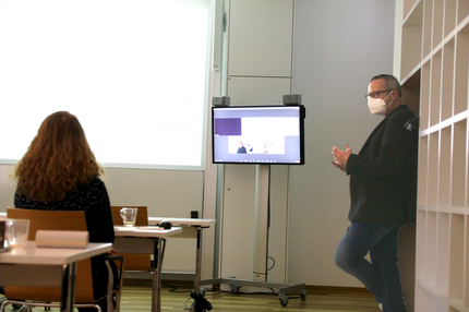 Bei Hybrid-Kursen können Sie sich von jedem Ort live zu unseren Präsenzkursen zuschalten. Sie sehen die Referentinnen und Referenten, die Präsentation und die Atmosphäre vor Ort – als wären Sie bei uns.