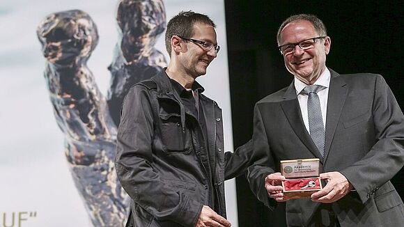 Festakt im Kongresszentrum am 27. September 2014. Der Architekt Dieter Schenk übergibt den Schüssel der neuen Akademie an den Präsidenten der Landeszahnärztekammer Baden-Württemberg, Dr. Udo Lenke.