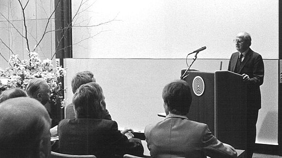 Seit 1986 findet der Karlsruher Vortrag im Weinbrenner Saal des Kongresszentrums Karlsruhe statt und findet große öffentliche Aufmerksamkeit. Hier spricht Prof. Heners die Einleitung zum Vortrag von Michael Blumenthal, Direktor des Jüdischen Museums Berlin.