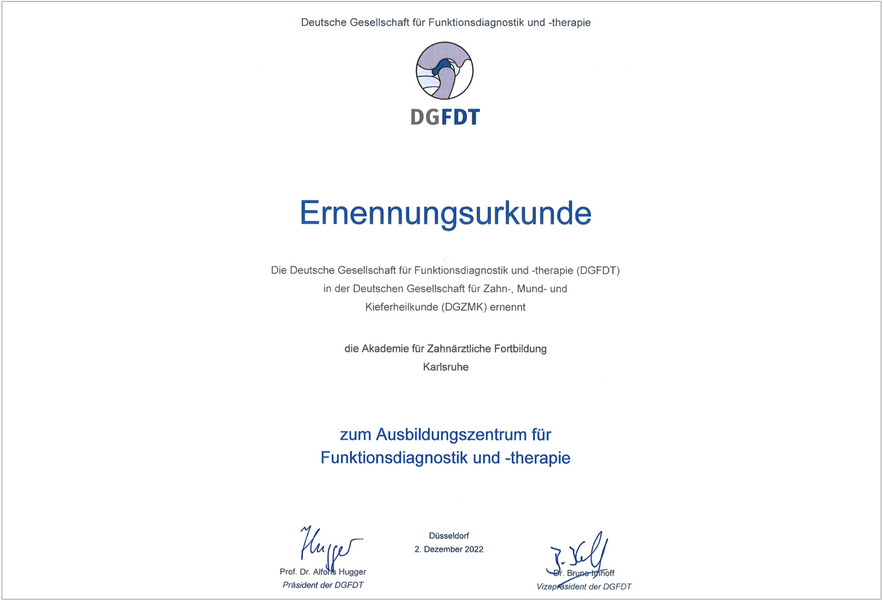 Die Deutsche Gesellschaft für Funktionsdiagnostik und -therapie (DGFDT) hat die Akademie für Zahnärztliche Fortbildung Karlsruhe zum Ausbildungszentrum für Funktionsdiagnostik und -therapie ernannt. Die Akademie gehört damit zum exklusiven Kreis von deutschlandweit nun insgesamt 14 universitären Einrichtungen und spezialisierten Zahnarztpraxen, die als Ausbildungszentrum