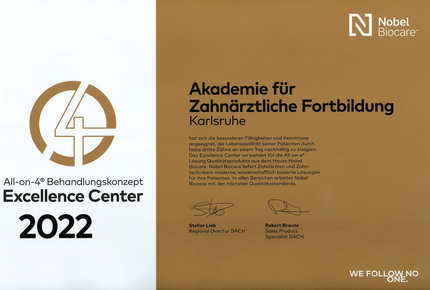Die Akademie für Zahnärztliche Fortbildung ist ausgezeichnet worden! Sie ist Excellence Center 2022 für das „All-on-4-Behandlungskonzept“. Dieses Konzept ermöglicht im zahnlosen Kiefer feste Zähne auf vier Implantaten. Es ist eine wissenschaftlich abgesicherte Methode, die in der Zahnärztlichen Akademie bereits seit vielen Jahren fest zum Behandlungsspektrum dazugehört.