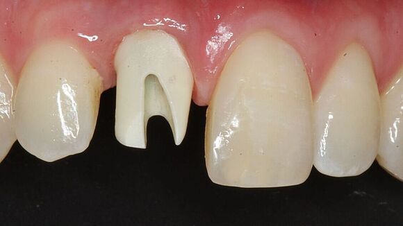 Derselbe Patient wie im Bild oben bevor die Krone befestigt wurde. Man sieht hier das „Abutment“, das Verbindungsteil zwischen dem Implantat – das fest in den Knochen eingewachsen ist – und der Zahnkrone. Damit die Farbe der Krone natürlich wirkt, wurde ein Abutment aus Keramik gewählt. Vorher war hier eine häßliche Zahnlücke, die den Patienten zwang, eine Prothese zu tragen.