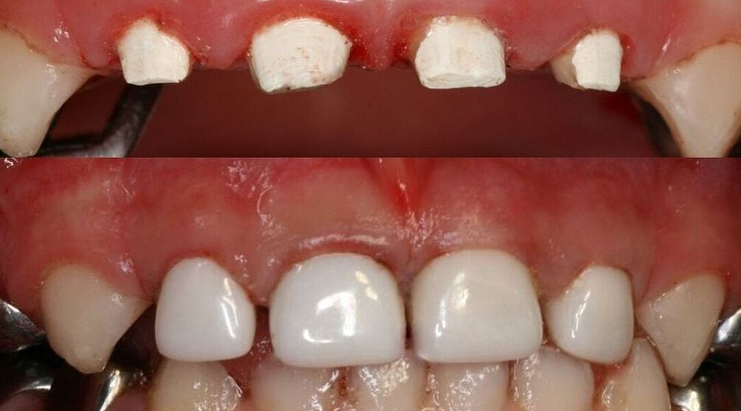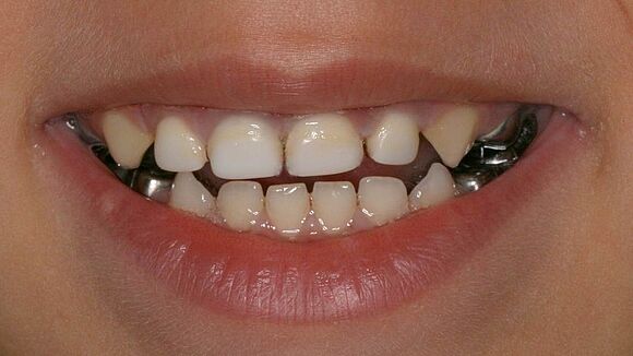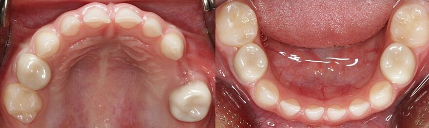 Dieses Milchgebiss wurde fachgerecht saniert. Die Karies ist verschwunden. Die Milchzähne werden erhalten, bis sie von den bleibenden Zähnen ersetzt werden. Dafür wurden auch Milchzahnkronen eingesetzt. Jetzt sind beste Bedingungen für eine effiziente Prophylaxe gegeben.