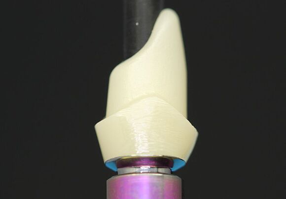 Der gefräste weiße Zahnstumpf aus Zirkon im Bild. Er wird mit einer Basis verklebt, die im Implantat festgeschraubt wird.