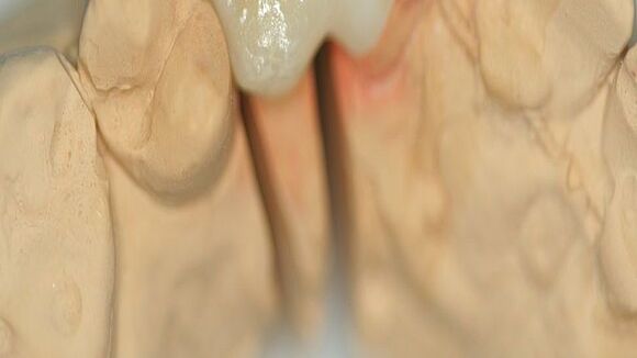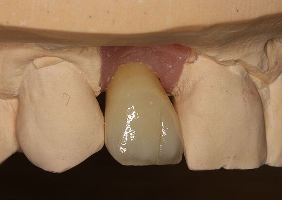 Im letzten Schritt der Herstellung wird die Keramische Krone auf dem Modell hergestellt.