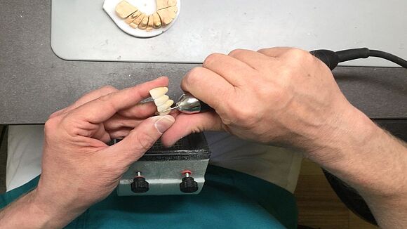 Die individuelle Schichtung oder das Aufstellen von Ersatzzähnen und die Kontrolle der Passung unter dem Mikroskop erfordert präzise Handarbeit.