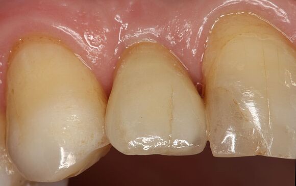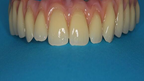 Auf den Zähnen sind "Keramik Onlays" befestigt. Die Zähne haben wieder ihre ursprüngliche Form und wirken ästhetisch überzeugend.